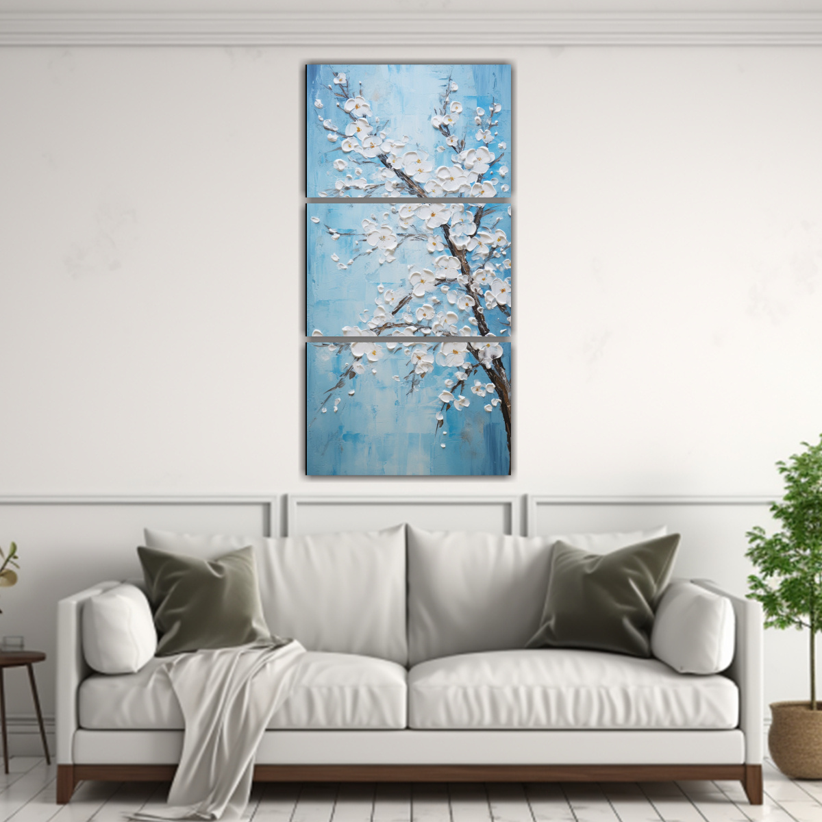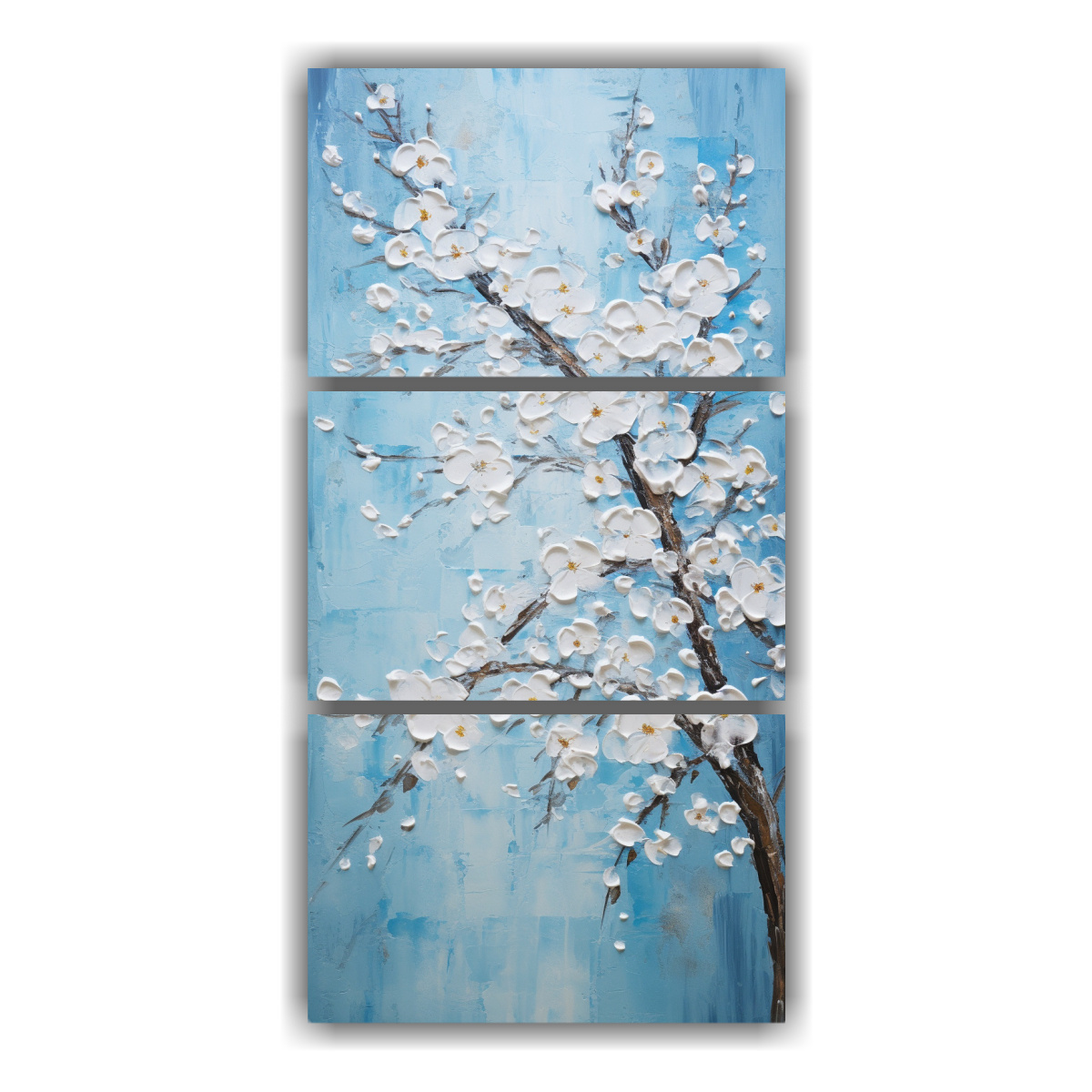Decora tus espacios con los Tres Lienzos acuarela Colores Vibrante con flores de cerezo azules en el lienzo de DecoCuadros Diseños exclusivos y entrega rápida en Santiago y envíos express a regiones