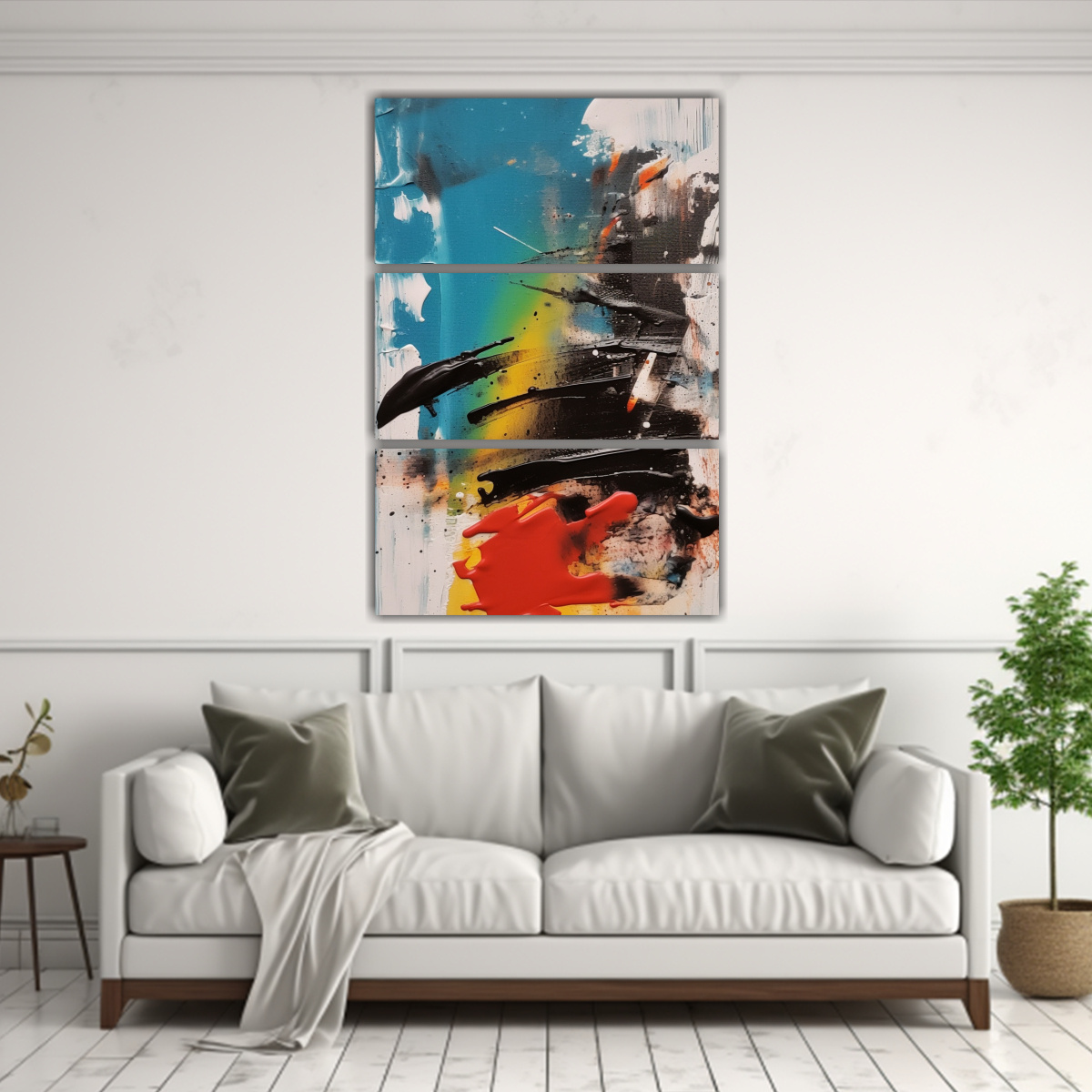 Tres Lienzos Cuadro Personalidad: Pintura Abstracta Con Rojo, Amarillo, Negro Y Azul En Decoración.