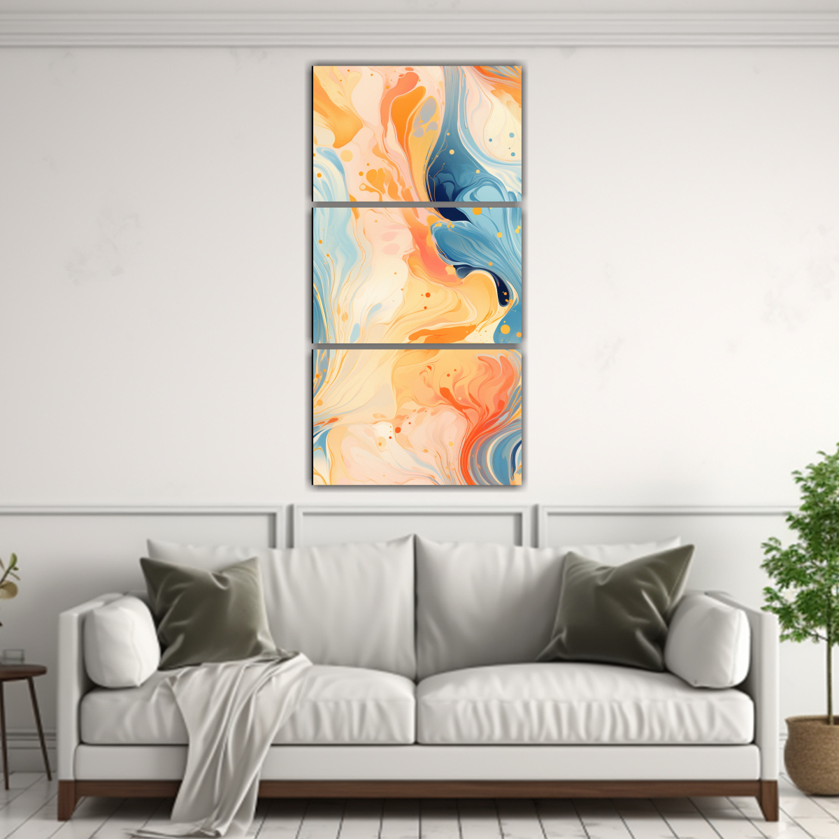 Este cuadro de tres lienzos de tela acuarela en contraste quedará perfecto en el salón de tu hogar Colócalos encima del sofá para darle un toque de color y estilo a tu espacio Combínalos con muebles en tonos neutros para resaltar su diseño abstracto ¡Crea un ambiente moderno y sofisticado con nuestros cuadros decorativos!