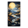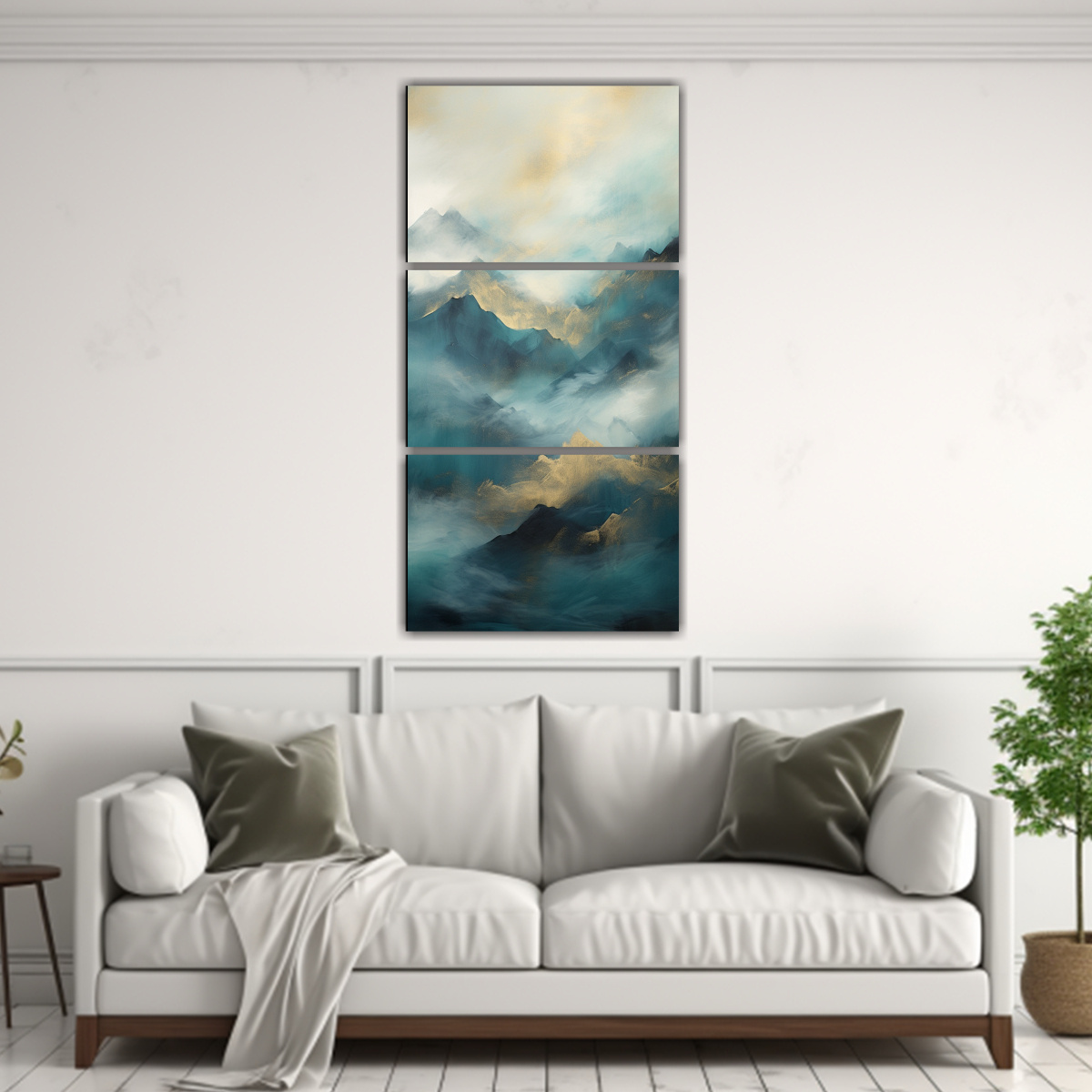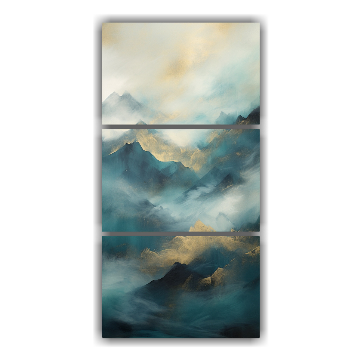 Tres Lienzos De Tela Impreso: Escena Noruega De Montaña En Tonos Vibrantes De Verde Azulado Y Dorado.