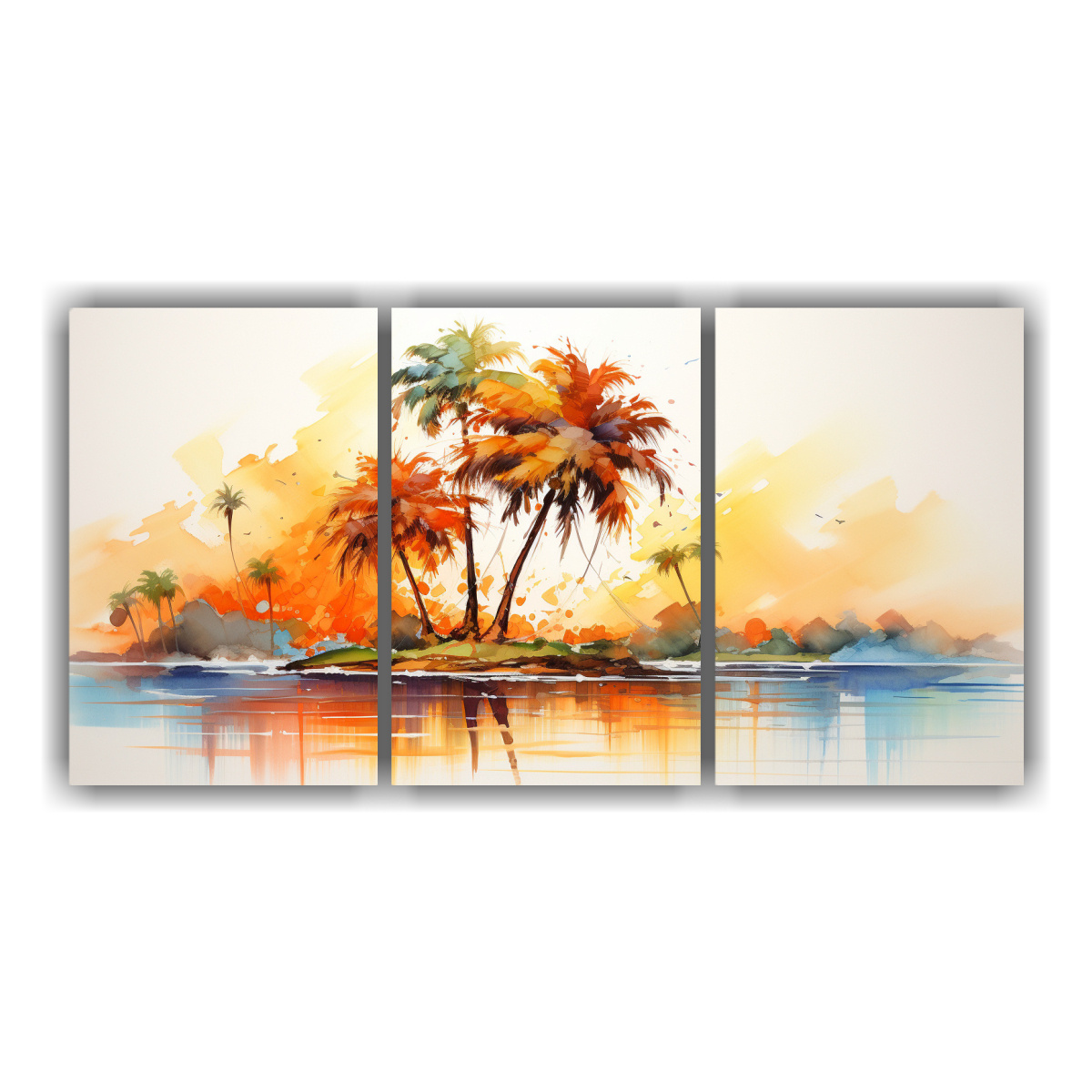 Tres Lienzos Decorativo Con Árbol Tropical En Colores Naranja, Pintura Abstracta Al Agua