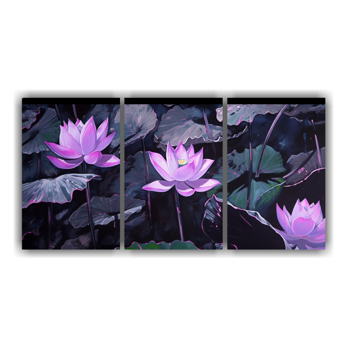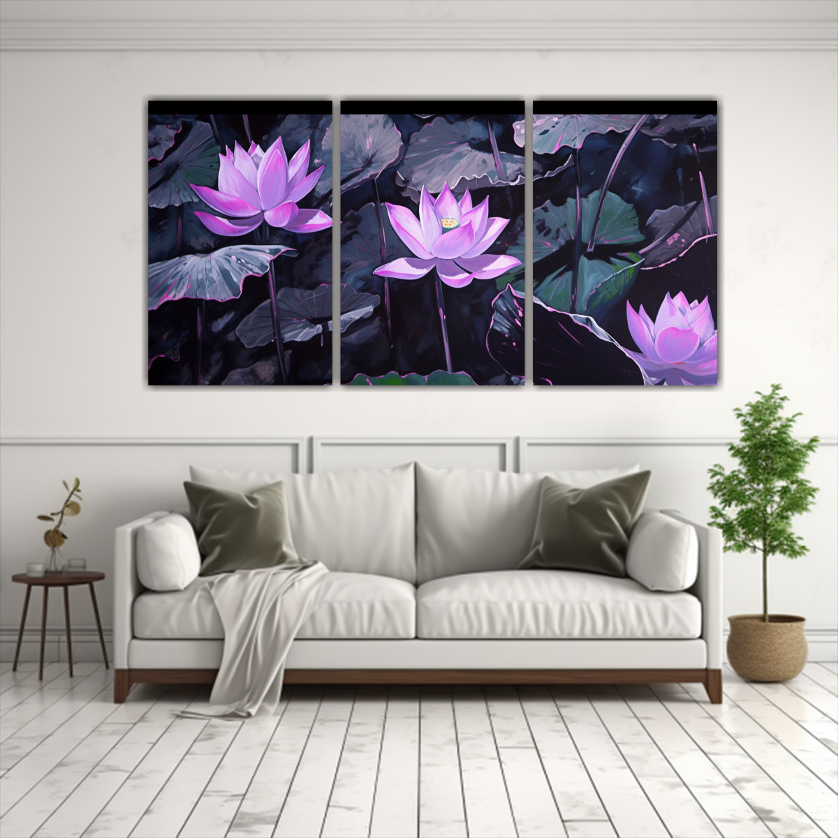 Tres Lienzos Hermoso Alegre Con Un Cuadro De Loto Negro Mágico En Lienzo Al Estilo De Decoración De Pinturas