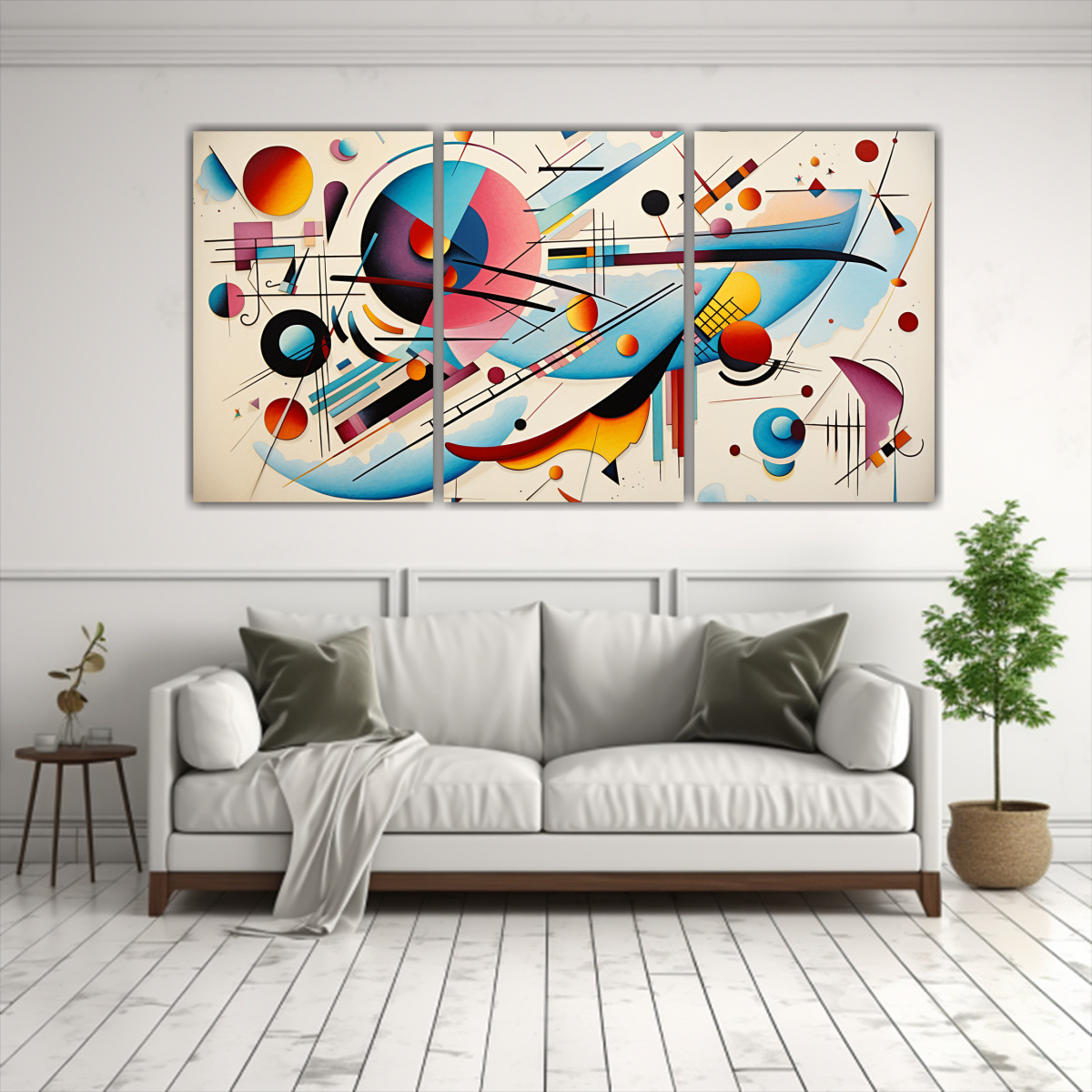 Este cuadro Tres Telas en Bastidor de Wassily Kandinsky es perfecto para decorar tu sala de estar o tu estudio Su modernidad y estilo abstracto le darán un toque único y sofisticado a tu espacio Combínalo con muebles en tonos neutros, como blanco o gris, para resaltar los colores vibrantes del cuadro Colócalo sobre una pared de color claro para que se convierta en el centro de atención ¡Atrévete a darle vida a tus paredes con esta increíble obra de arte!