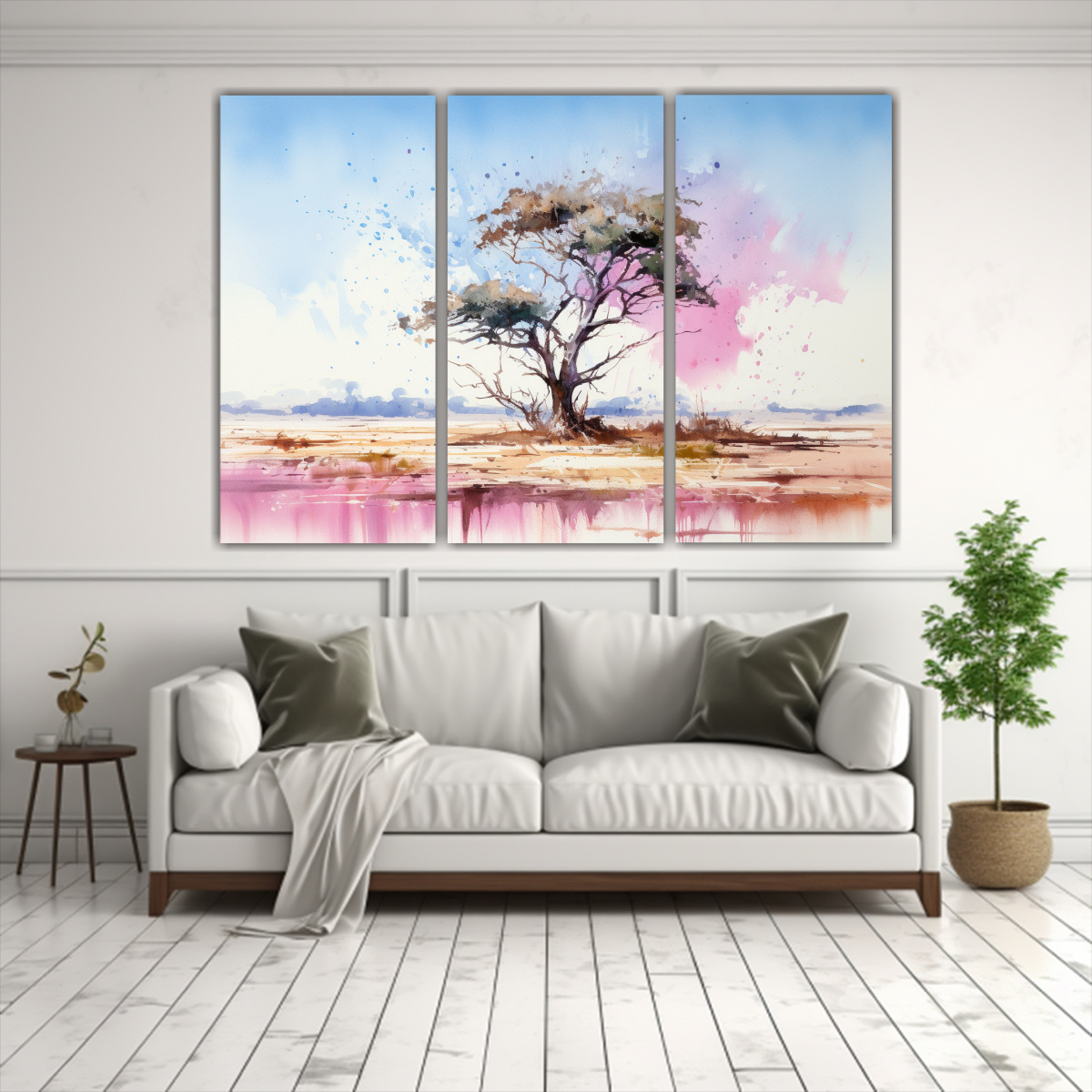 Tríptico Abstracto Efecto Visual Árbol De Sabana Y Desierto, Colores Rosa Y Azul
