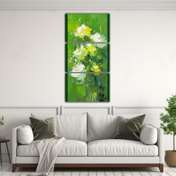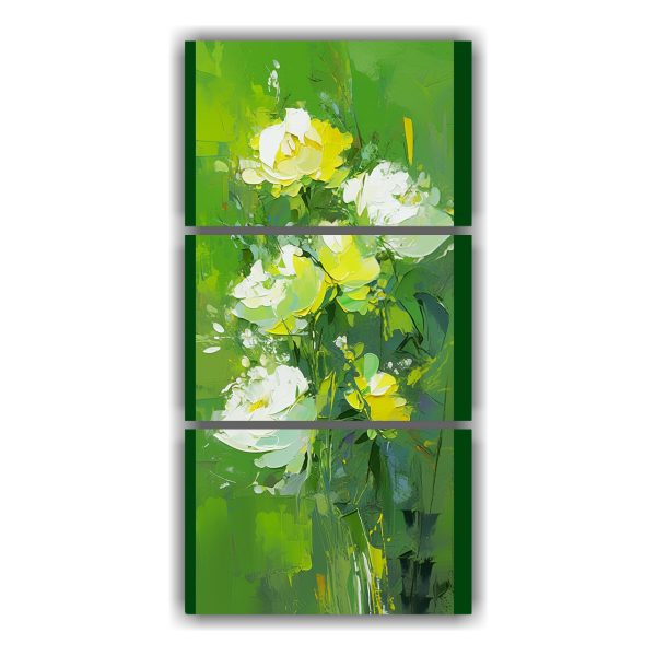 Tríptico Alta Calidad: Flores Verdes Simétricas En Lienzo Estilo Decorativo.