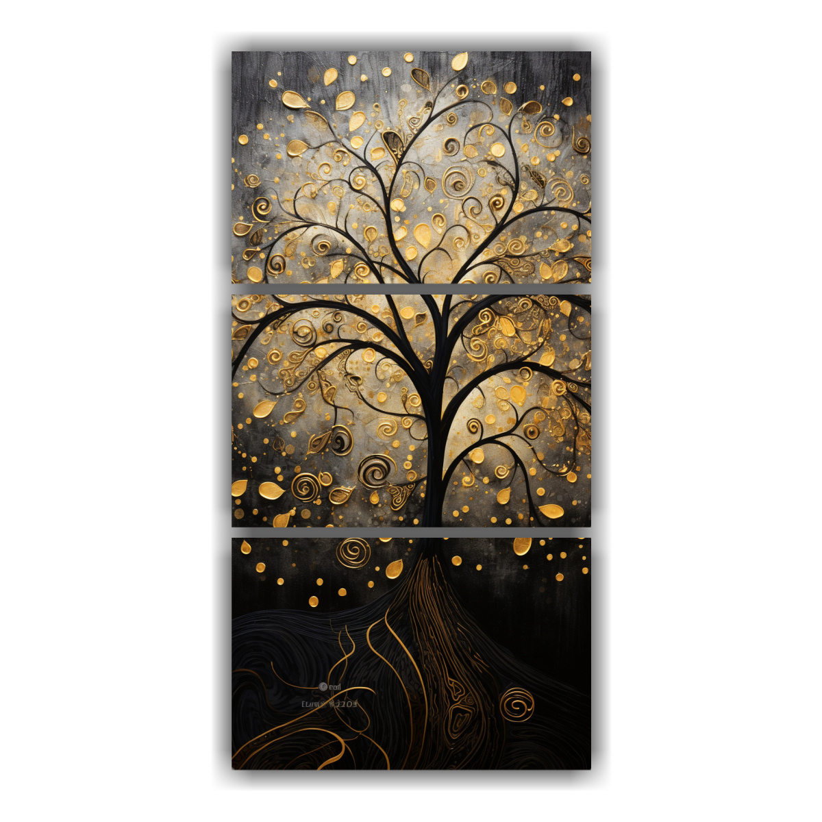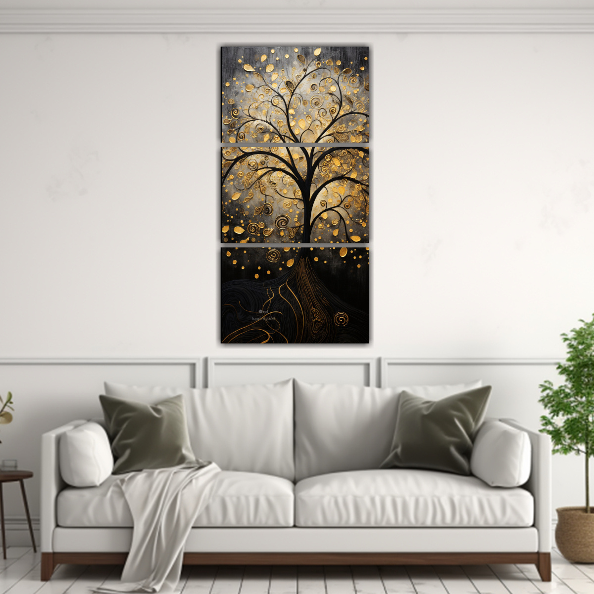 Añade un toque de elegancia y estilo a tu hogar con el Tríptico Árbol Negro y Dorado en Estilo Galería Este cuadro decorativo cuenta con colores plateado, dorado, negro, gris, azul marino grisáceo, mostaza y chocolate, y está impreso en tela de alta calidad con bastidores de madera