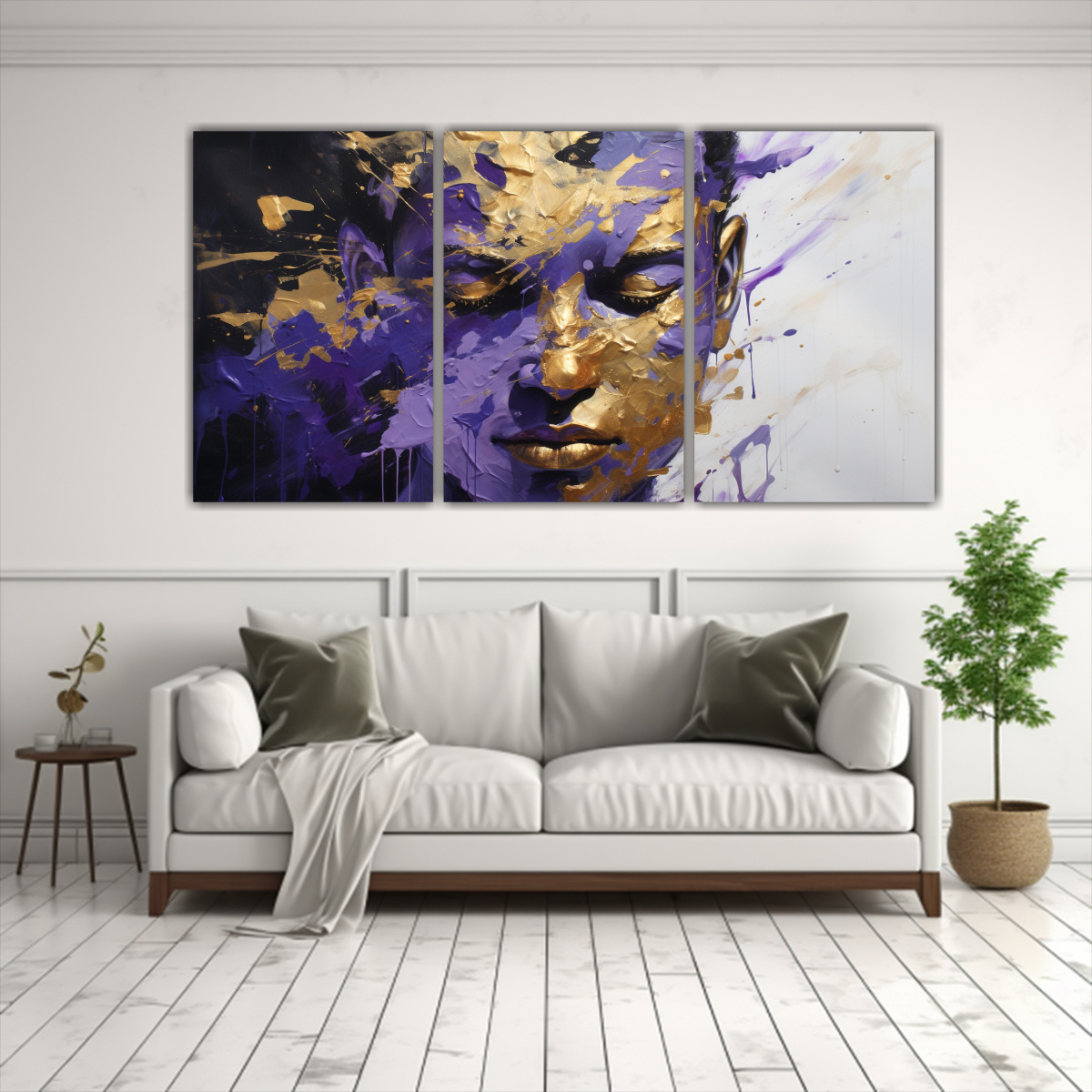 Este tríptico Arte Simetría Facial Tonos Oro y Púrpura es perfecto para darle un toque sofisticado a tu sala de estar Colócalo sobre un sofá en tonos neutros, como gris claro o beige, para resaltar su belleza Además, puedes combinarlo con cojines en tonos dorados y púrpuras para crear una armonía en la decoración ¡No esperes más y dale vida a tus paredes con este tríptico único en su estilo!