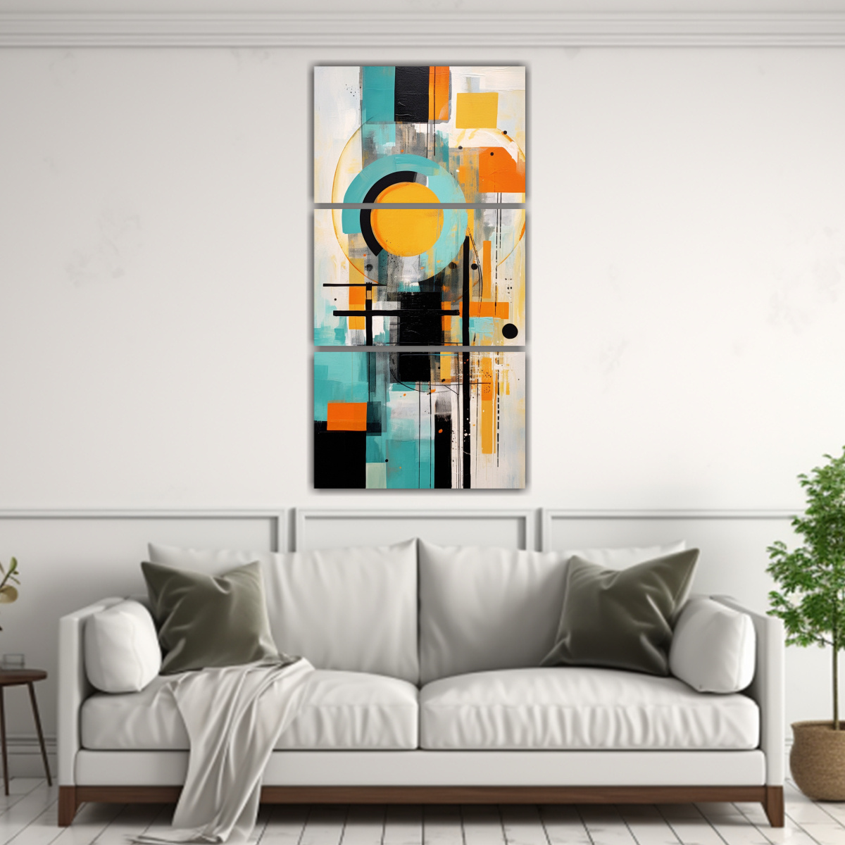 Tríptico Cuadro Abstracta De Pintura Rectangular En El Estilo De Impresiones Solares Con Audaces Geometrías.