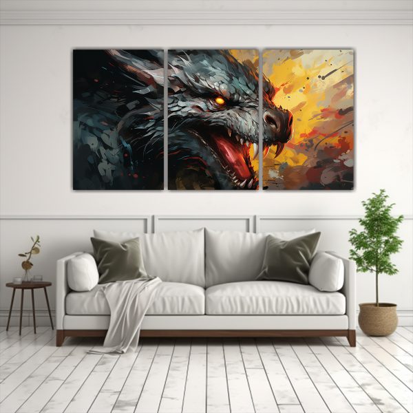 Coloca este Tríptico Cuadro de Dragón en Amarillo y Rojo en el living, sobre un mueble auxiliar o en una pared libre de la sala, para darle un toque vibrante y misterioso Combínalo con muebles en tonos oscuros para resaltar su intensidad y crear un ambiente moderno y sofisticado