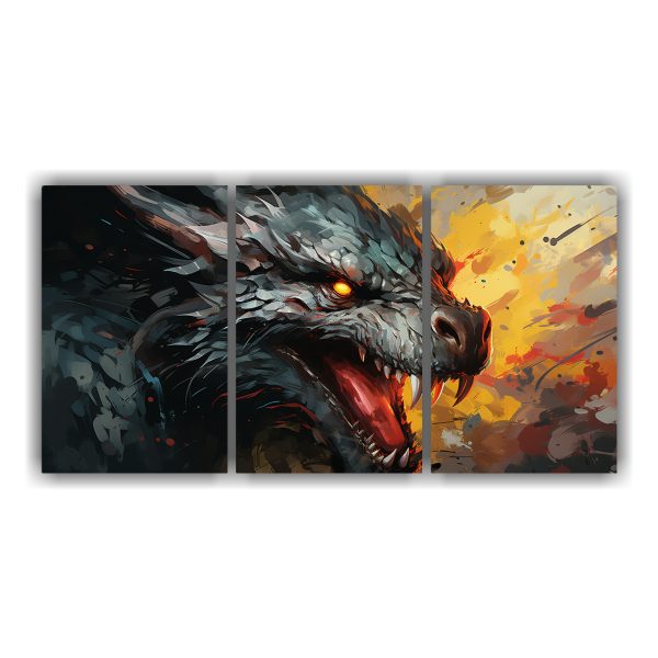 Tríptico Cuadro De Dragón En Amarillo Y Rojo, Ambiente Neonoir