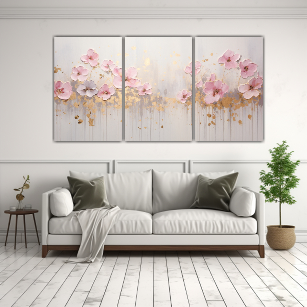 Este tríptico de alta calidad con representación en acrílico sin costuras sobre fondo blanco es perfecto para decorar una sala de estar moderna Puedes colocarlo sobre un sofá gris para resaltar los colores plateado y beige del cuadro Además, puedes complementar la decoración con cojines en tonos lila y dorado para lograr un ambiente sofisticado y armonioso