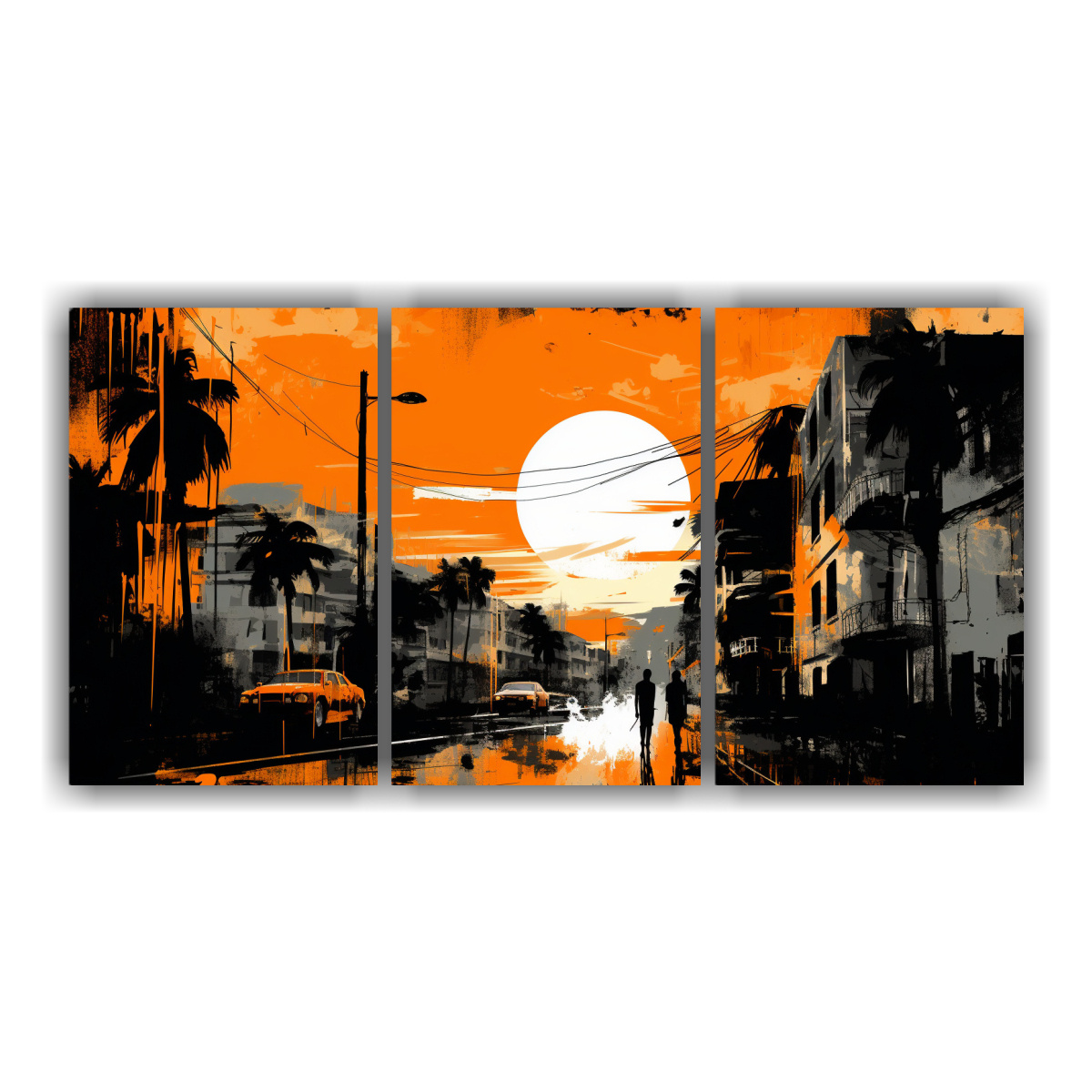 Este tríptico en tonos anaranjados, grises y negros, con un toque de beige, azul marino grisáceo y plateado, es perfecto para darle a tu espacio un toque moderno y urbano Colócalo en tu sala de estar para resaltar la decoración con estilo street art