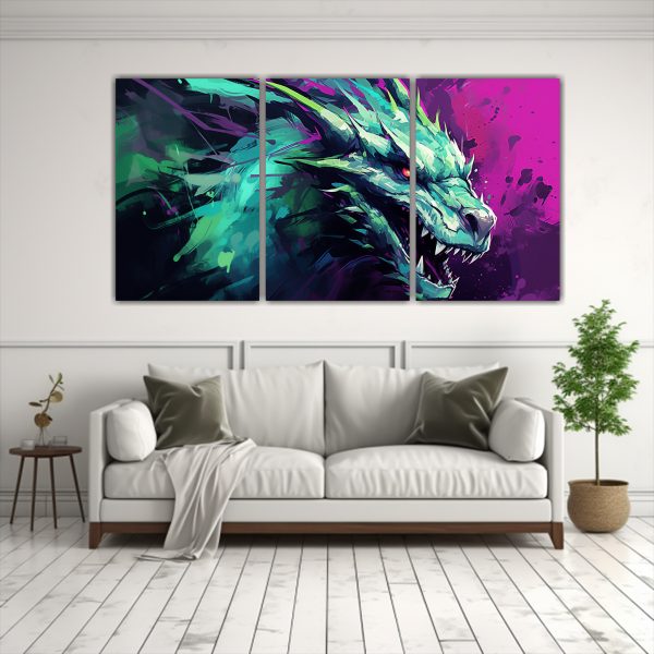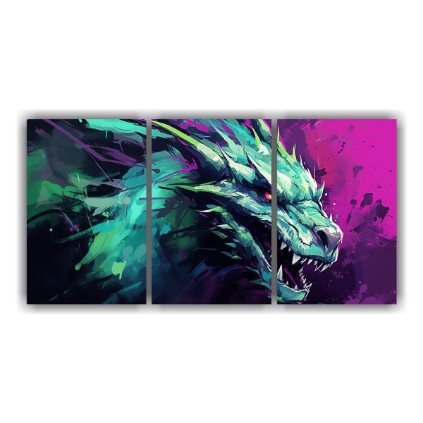 Tríptico De Dragón En Tonos Verdes Y Morados, Atmosfera Neonoir