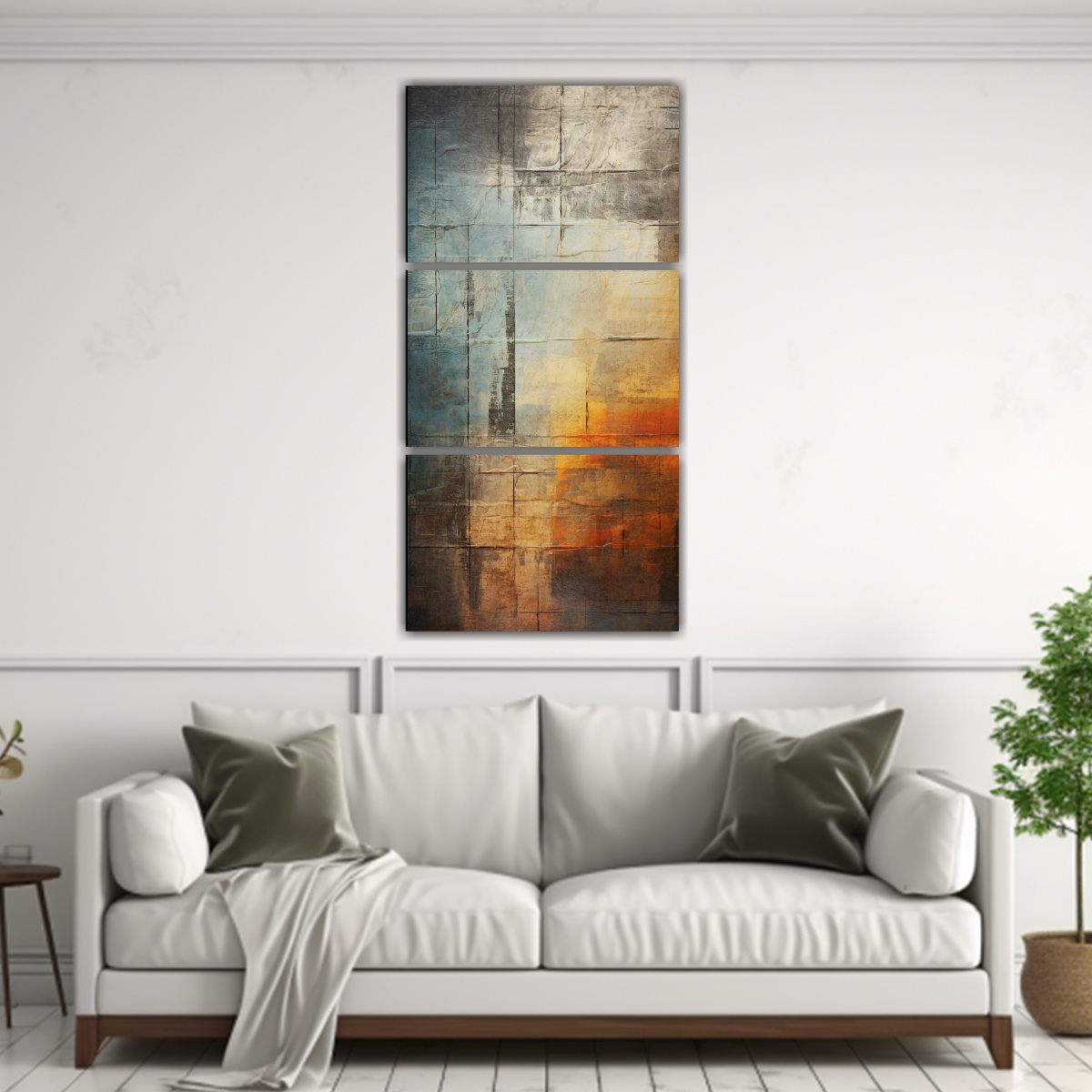 Coloca este Tríptico de Lienzos de Tela Inspiración Calidez grunge abstract pseudo fotografía texturizada oleo p en tu sala de estar para darle un toque moderno y sofisticado Combinará de manera perfecta con muebles en tonos grises o azul marino grisaceo, agregando calidez y elegancia a tu espacio