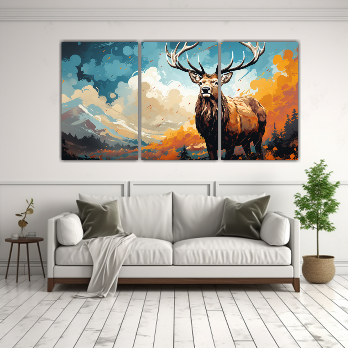Tríptico Estilo Galería Arte Estético: Alce En Nieve Y Azul Cielo.
