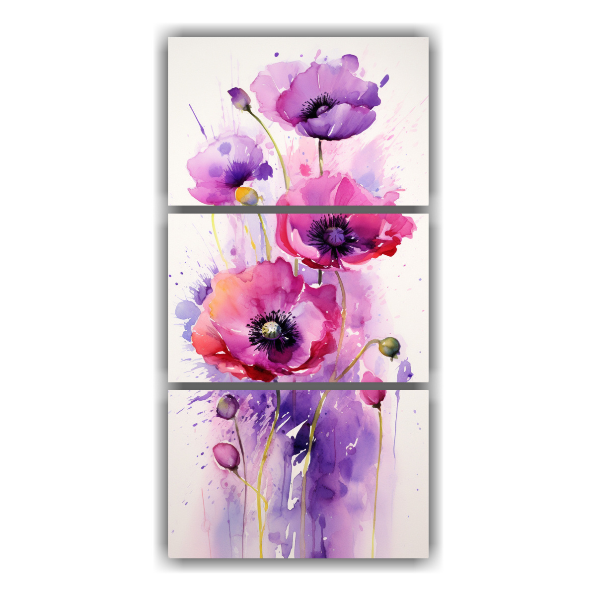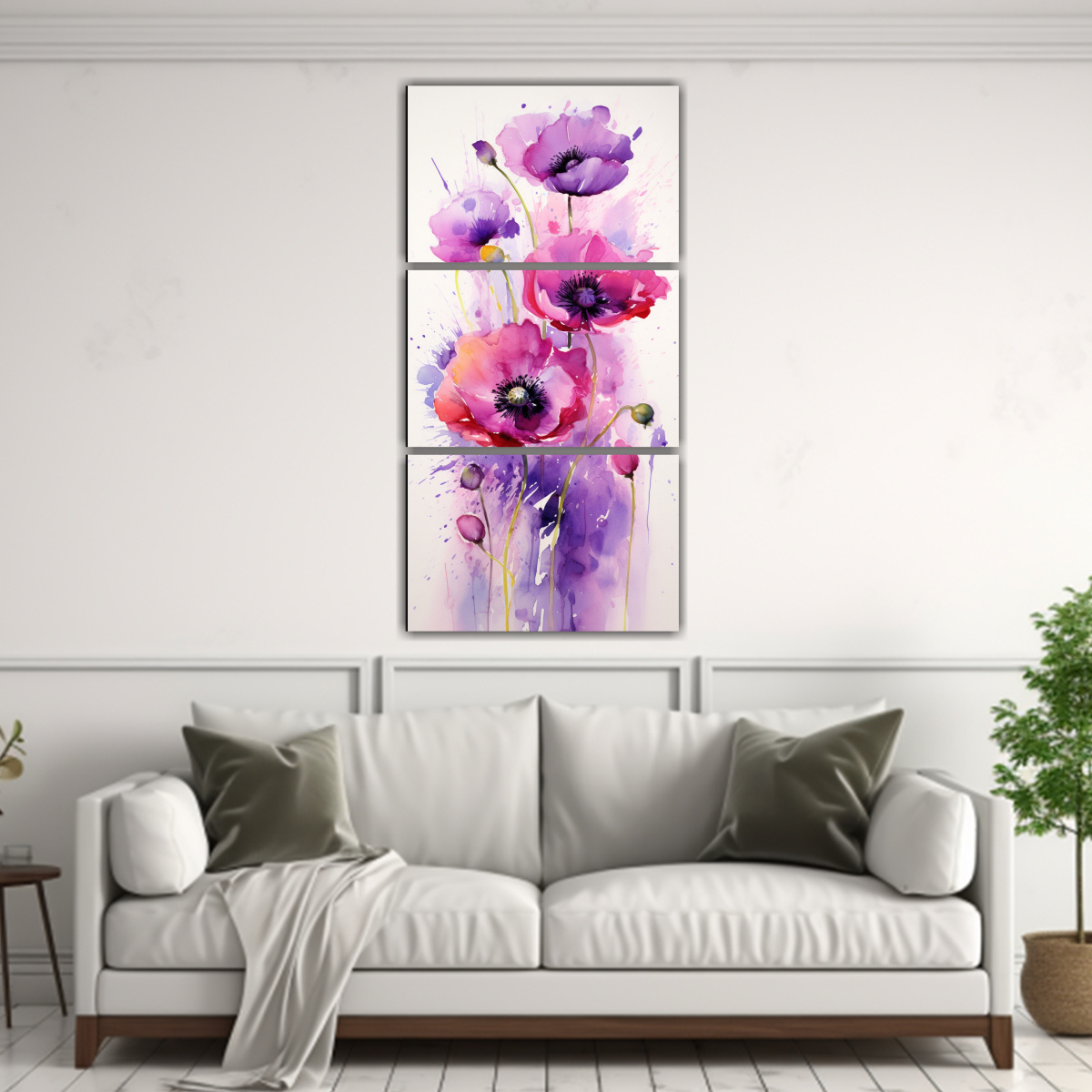 Tríptico: Flores Amapolas Púrpuras Abstracto En Acuarela.