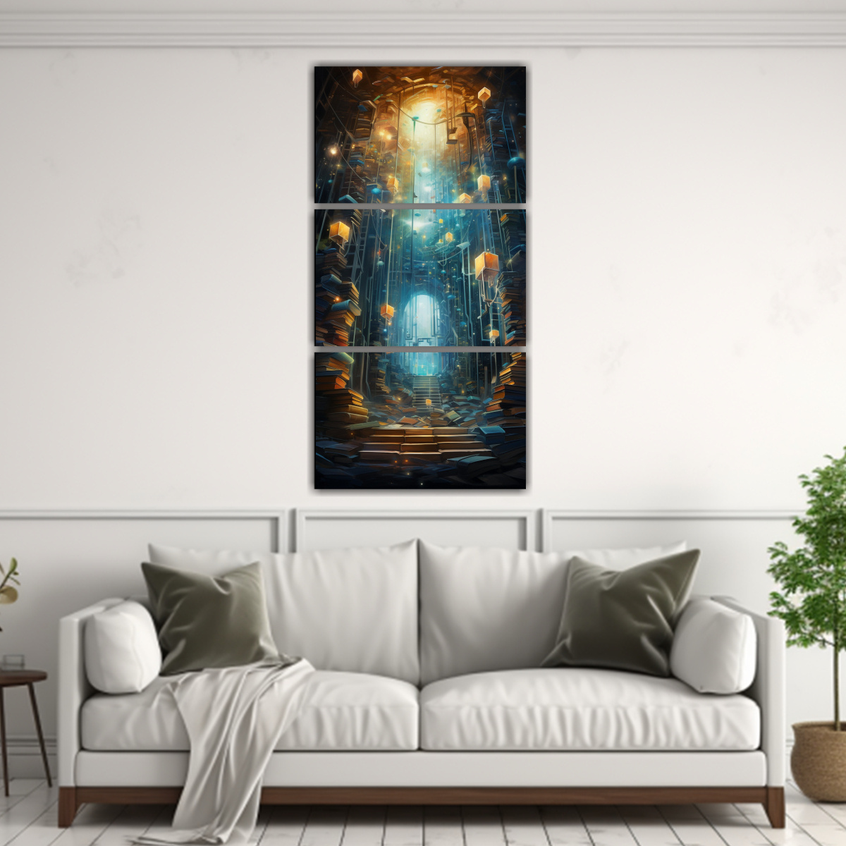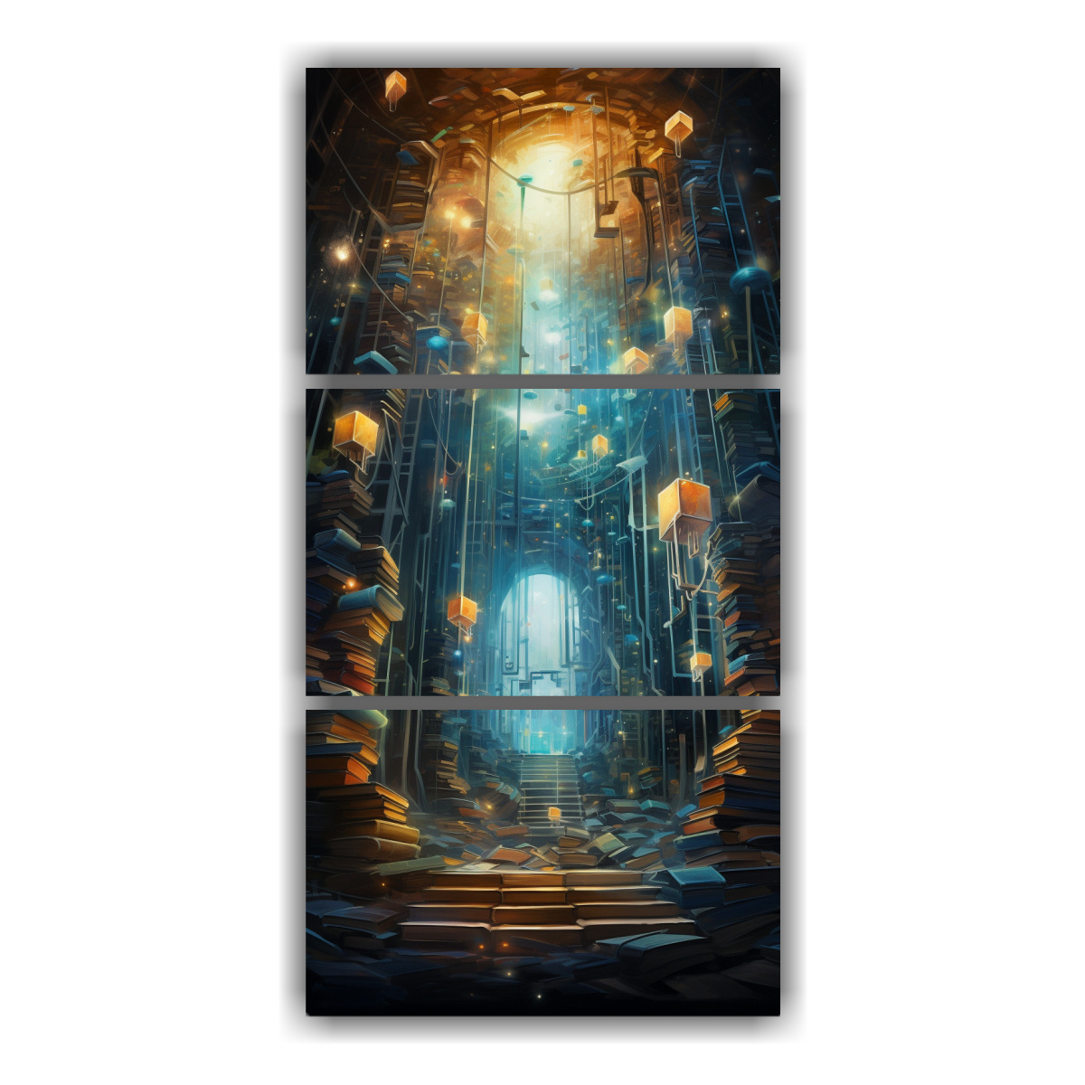 Realza tu espacio con este tríptico abstracto que evoca la mística de una biblioteca, ideal para salas o estudios Su combinación de colores encaja perfectamente en ambientes modernos y elegantes ¡Hazte con el tuyo y transforma tu decoración!