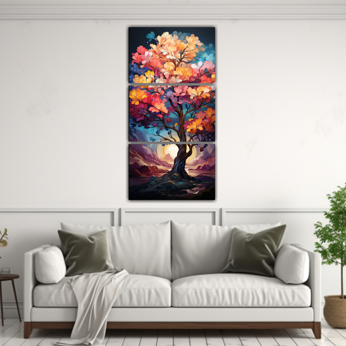 Para resaltar la belleza del Tríptico Minimalista A Mango Tree in Rainbow Colors, te recomiendo colocarlo en una pared blanca para que los colores resalten y se convierta en el punto focal de la habitación Combínalo con muebles en tonos neutros para crear un ambiente moderno y sofisticado