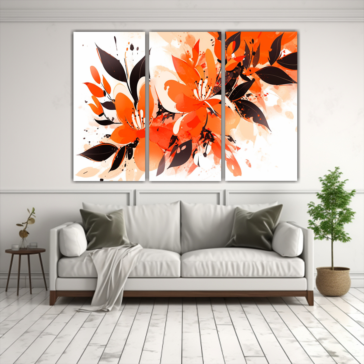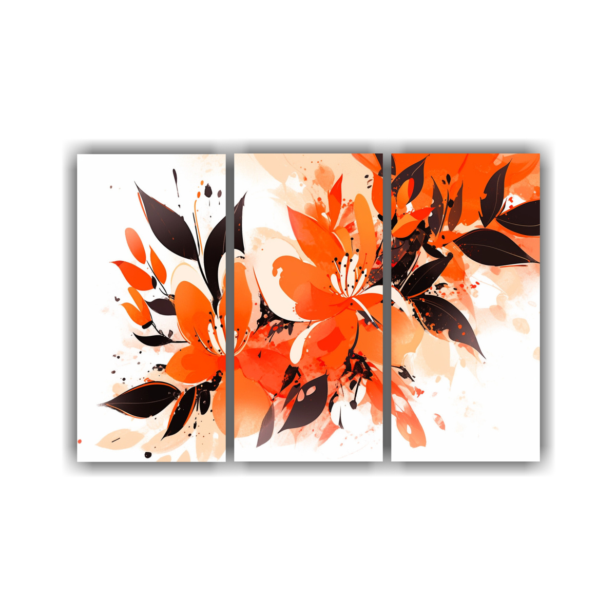 Este impactante tríptico en colores naranja puede ser colocado sobre la bañera para crear un ambiente sofisticado y moderno Combínalo con toallas en tonos neutros para resaltar su vibrante paleta de colores