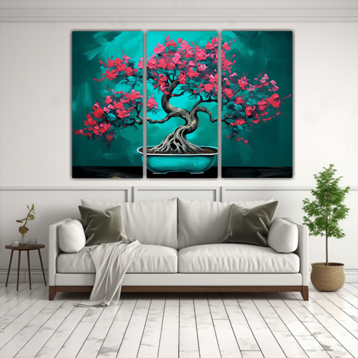 Este Tríptico Moderno Bougainvillea y Bonsái en Turquesa Neonoir quedará espectacular en tu sala de estar, sobre un mueble de color blanco para resaltar sus tonos vibrantes Complementa con cojines en tonos similares para un ambiente armonioso y moderno