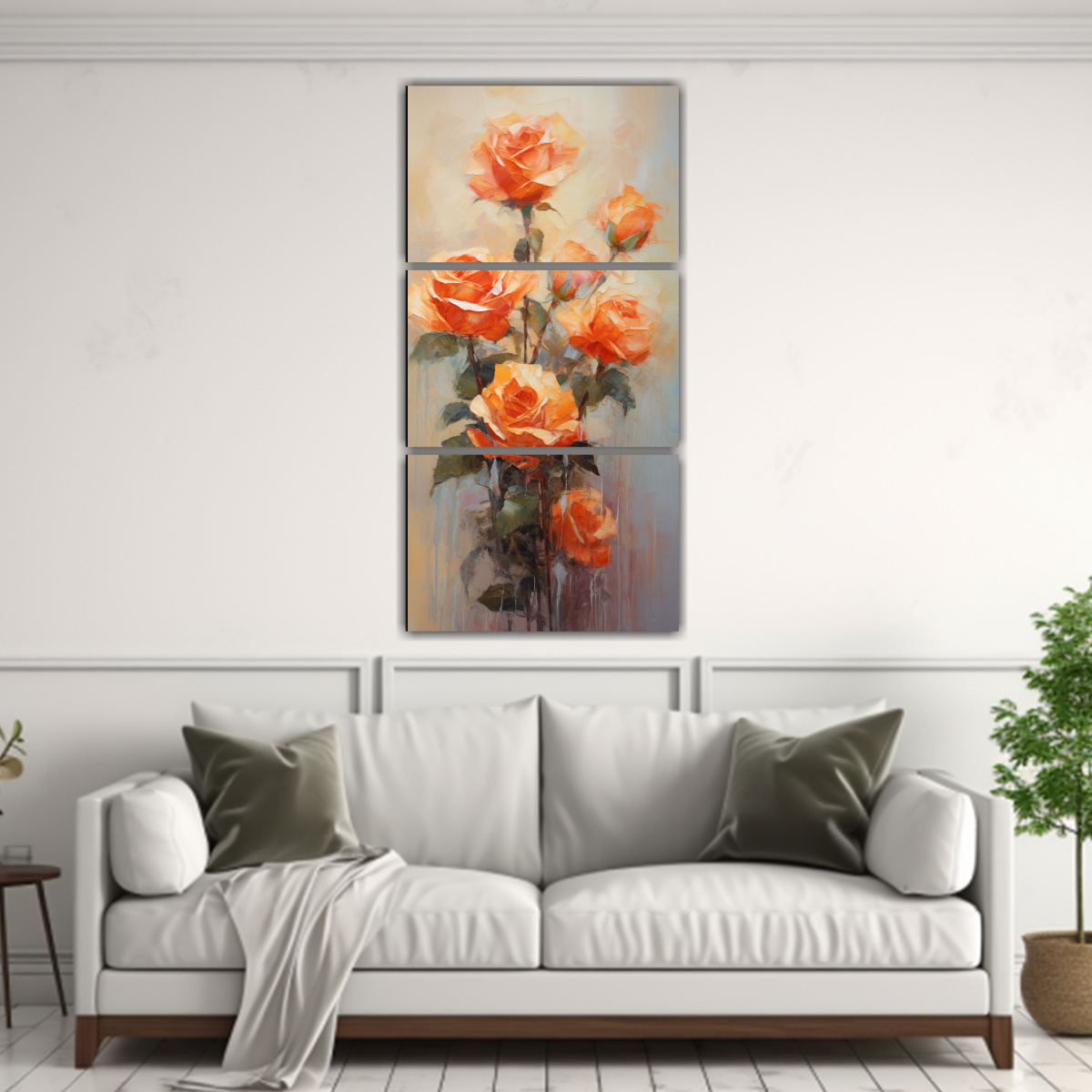 Descubre la belleza natural plasmada en este tríptico de rosas naranjas, perfecto para añadir un toque de sofisticación a tu hogar Calidad premium y entrega rápida en Santiago, envíos express a regiones