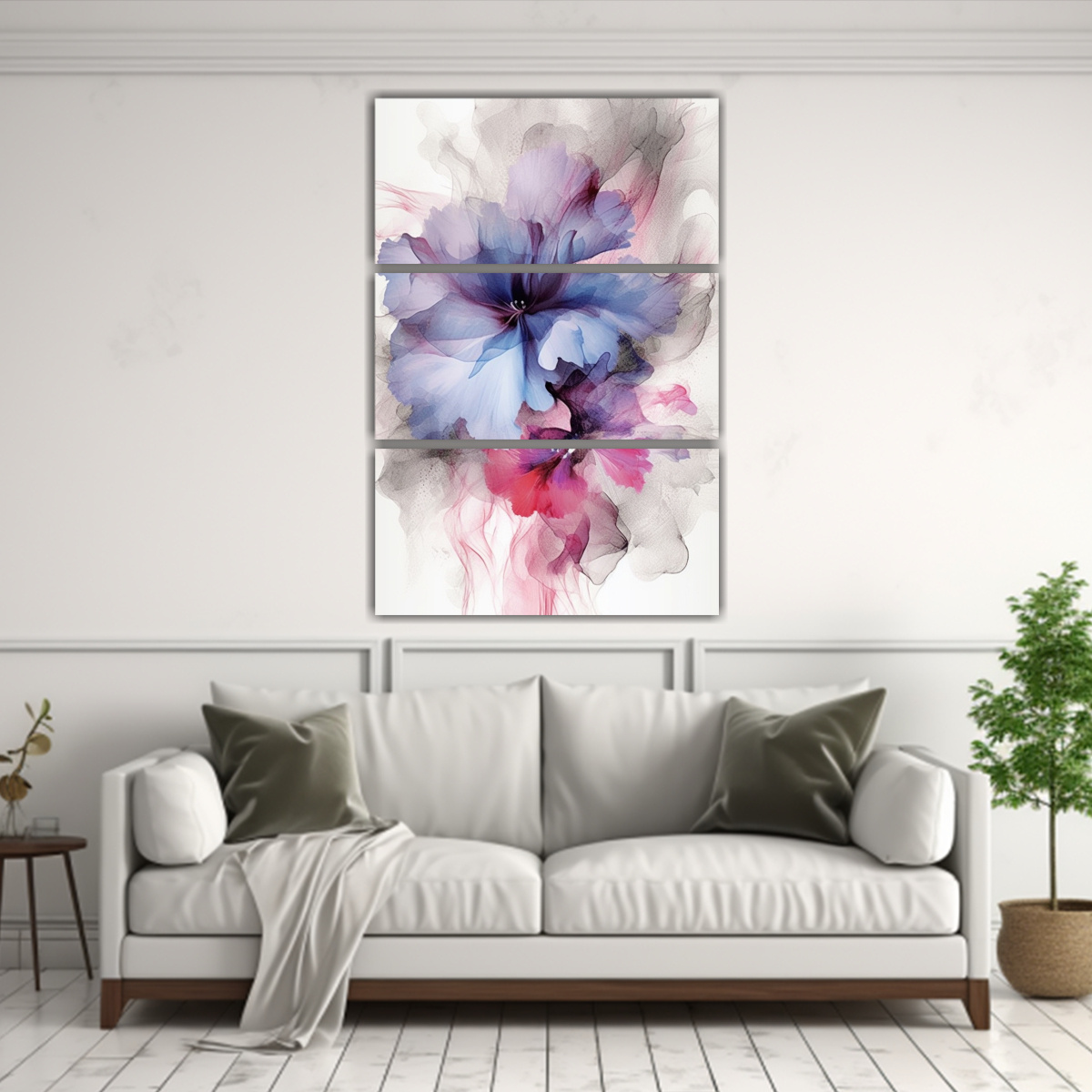 Este tríptico Patrón Floral Intenso se vería perfecto en un salón o comedor elegante, combinando con muebles en tonos grises o plateados para resaltar su belleza y sofisticación