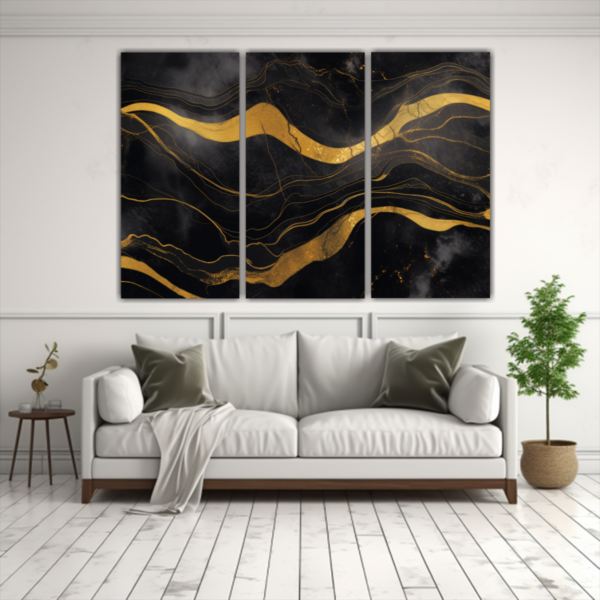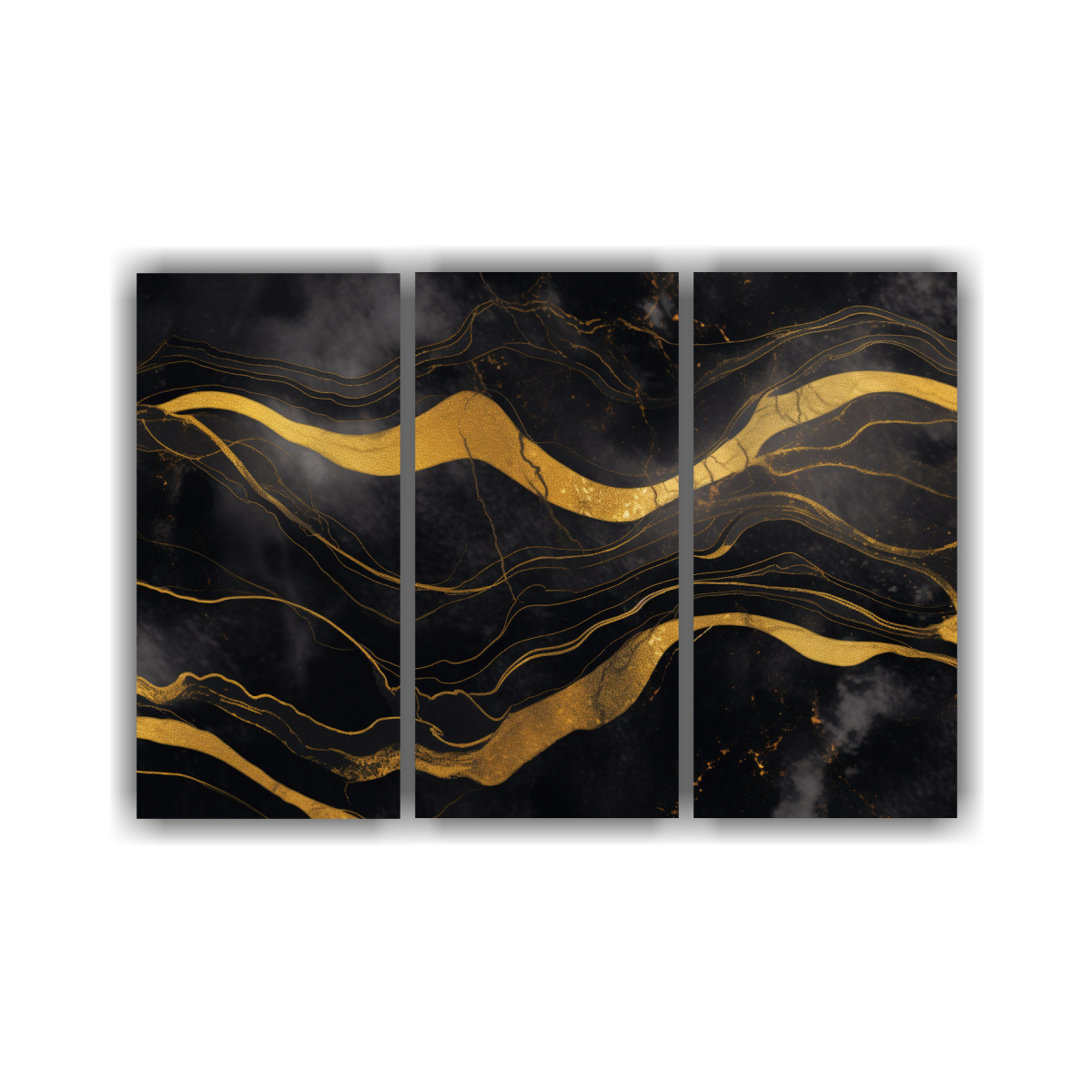 Tríptico Patron Intenso Adorno Mármol Negro Con Remolino Dorado