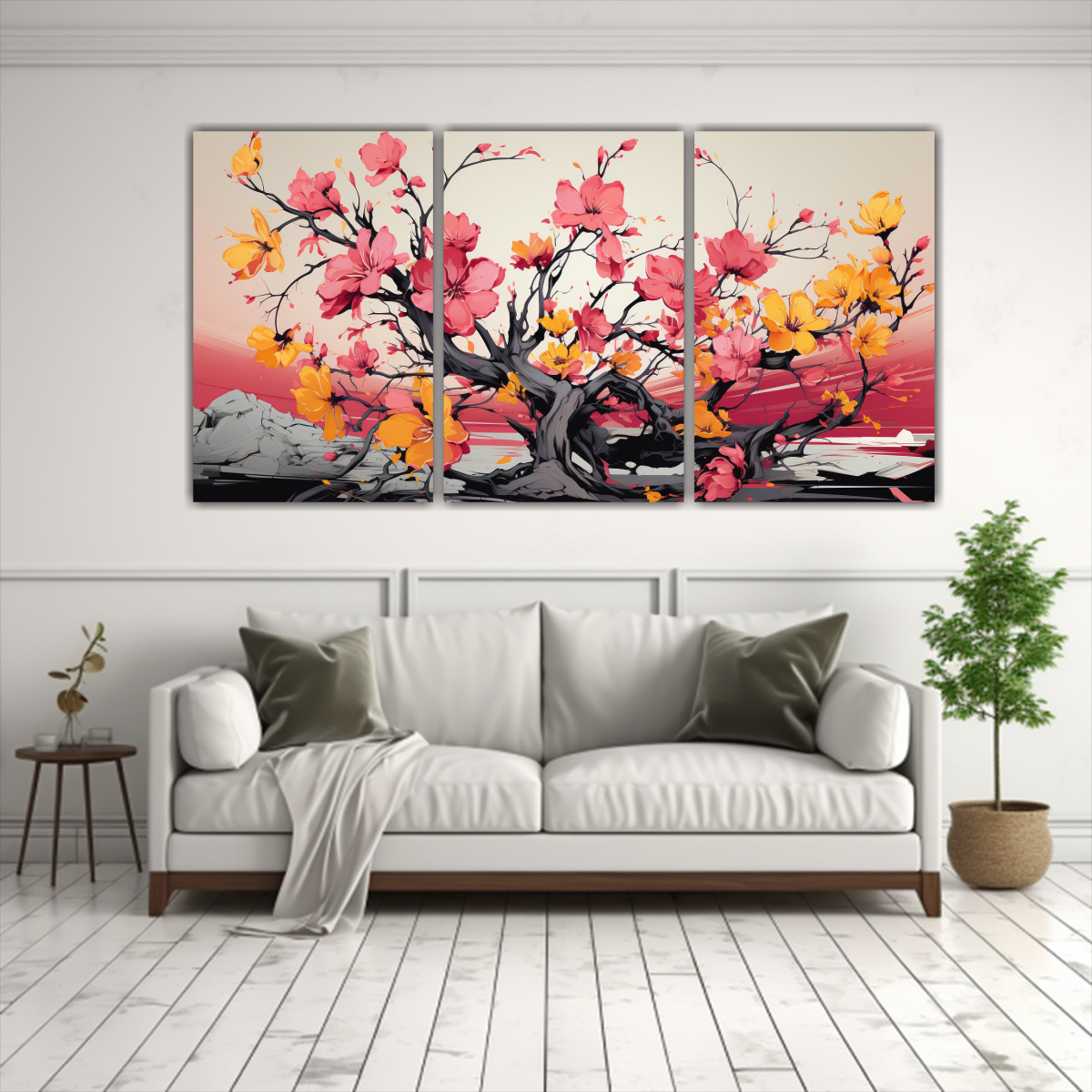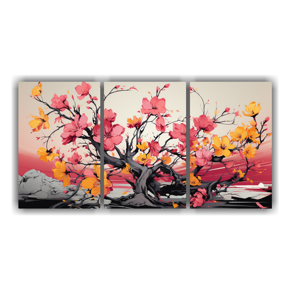 Tríptico Pintura Decorativa De Abstracción Profundidad Árbol De Ocotillo En Colores Amarillo Y Rosa Con Atmósfera Neonoir