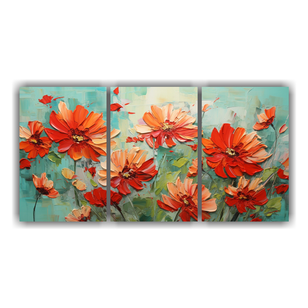 Tríptico Vanguardista De Flores Verdes Y Rojas En Tela
