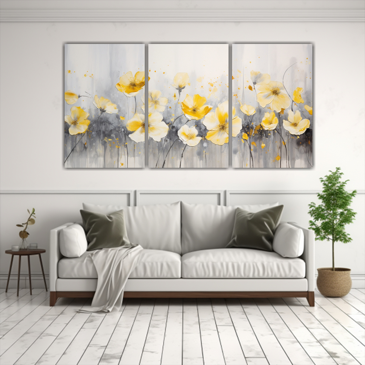 El tríptico vintage Originalidad es una pintura acrílica única que dará un toque de elegancia y originalidad a cualquier espacio Con su paleta de colores plateado, azul marino grisaceo, mostaza, gris y dorado sobre un fondo blanco, este cuadro se convertirá en el centro de atención de tu decoración