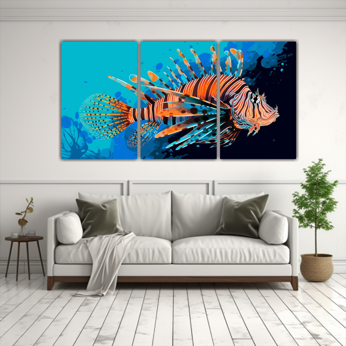 Para realzar la belleza del Tríptico Vitalidad Lionfish y Colores Cyan, colócalo en la pared principal de tu sala de estar Combínalo con muebles en tonos neutros para crear un contraste impactante ¡Deja que este cuadro sea el centro de atención en tu hogar!