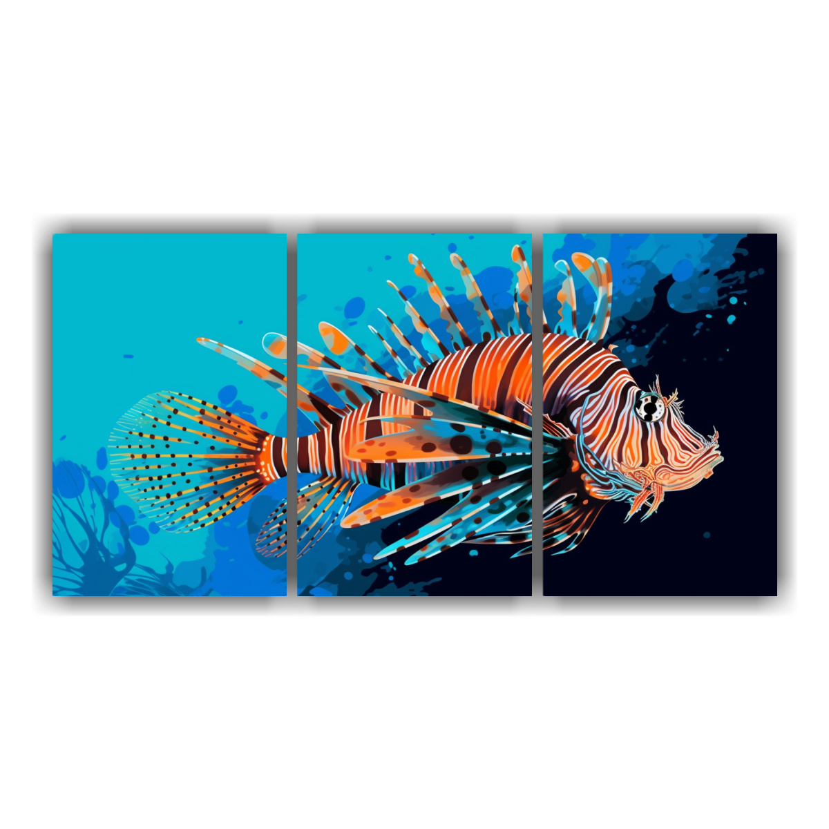 Tríptico Vitalidad Lionfish Y Colores Cyan Neo Pop Art