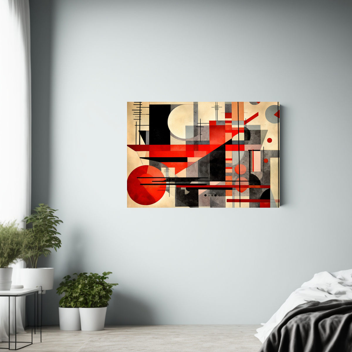 Este cuadro de arte constructivista en tela bastidor quedaría perfecto en un ambiente moderno, combinando con muebles en tonos neutros y detalles en colores vibrantes Colócalo en tu sala de estar para crear un punto focal único y sofisticado