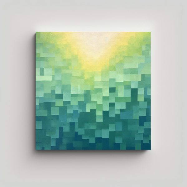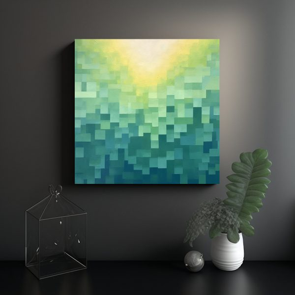 Este cuadro de simetría en tonos turquesa, azul marino y verde azulado lucirá espectacular en una pared blanca junto a muebles de diseño minimalista Combínalo con cojines en tonos plateados y grises para lograr una decoración elegante y contemporánea
