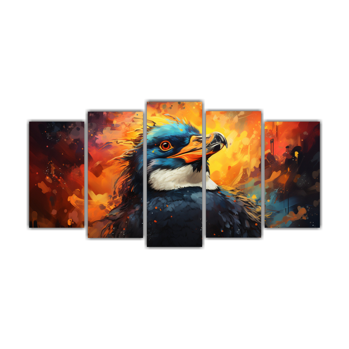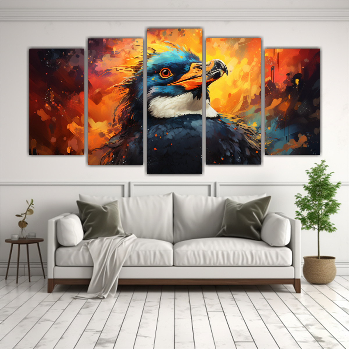Coloca este conjunto de cinco telas en bastidor estilo acuarela de pingüinos en una pared blanca para destacar la intensidad de los colores Ideal para salas de estar, habitaciones o espacios de trabajo que buscan un toque de color y originalidad