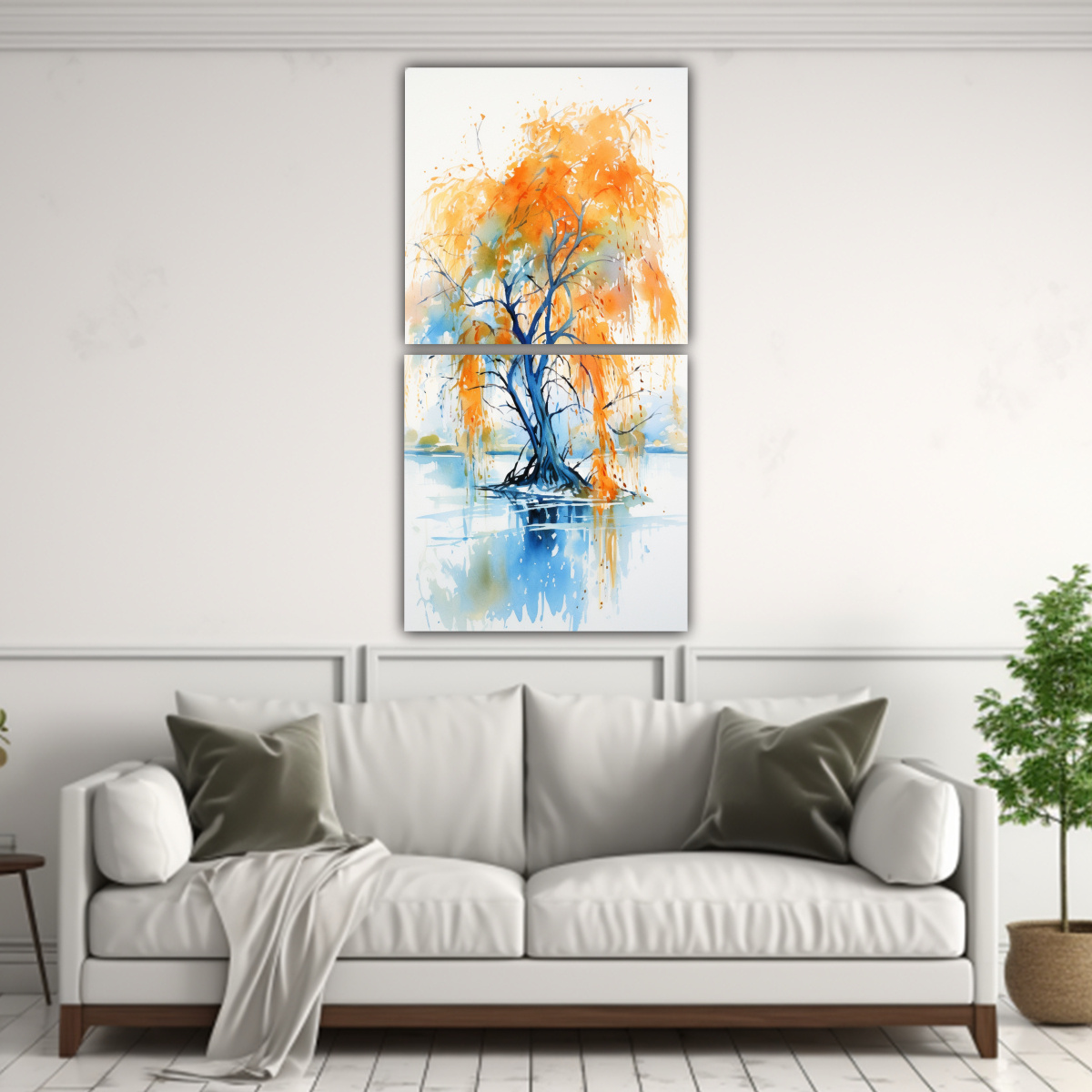 Venta De Dos Lienzos De Tela Armonía A Un Sauce Árbol Pintura Abstracta En Colores Naranja Y Azul